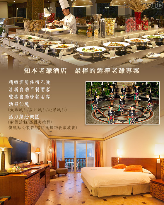 商品訊息簡述: 只要5800元(雙人價)即可享【知本老爺酒店】原價11330元最棒的選擇老爺專案:精緻客房住宿乙晚+清新自助早餐兩客+豐盛自助晚餐兩客+活泉仙境(天幕風呂/星月風呂/心采風呂)+活力繽紛樂園(射箭活動/高爾夫推桿/傳統點心製作/原住民舞蹈表演欣賞)。
